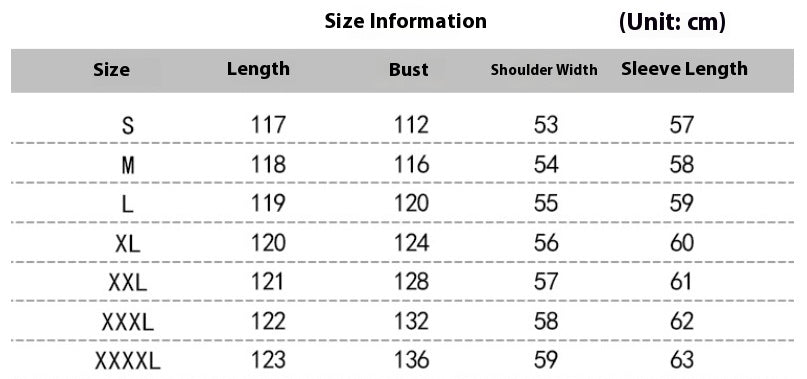 The coat is available in a range of sizes from XS to 4XL, ensuring a perfect fit for everyone. It's important to note that Asian sizes are typically 1 to 2 sizes smaller than European and American sizes, so we recommend selecting a larger size if you're uncertain.