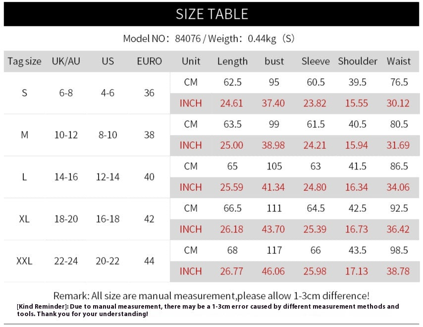 The main fabric composition is made of PU, ensuring durability and a soft feel against the skin. This coat is designed for a flattering fit, with sizes ranging from S to XXL. It's essential to note that sizes may differ from your usual choices; therefore, we recommend selecting a larger size if you find yourself between two sizes. Additionally, please allow for minor measurement discrepancies due to manual sizing.
