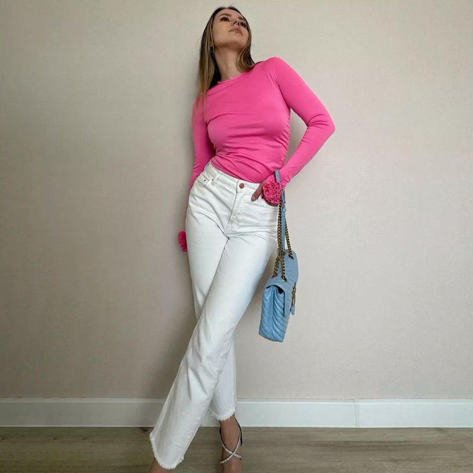 Q: What colors is this top available in?A: This top is available in pink, rose red, and light blue.