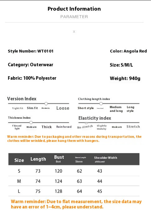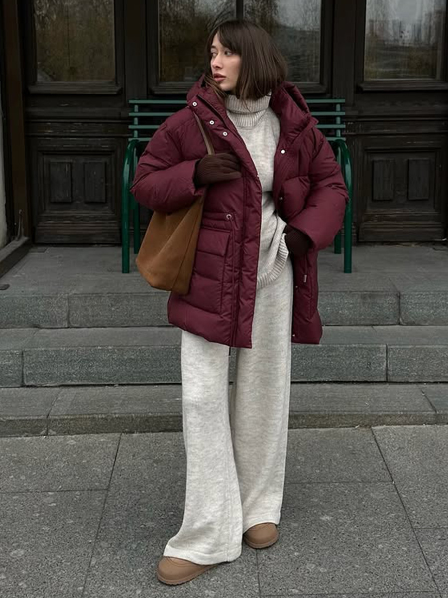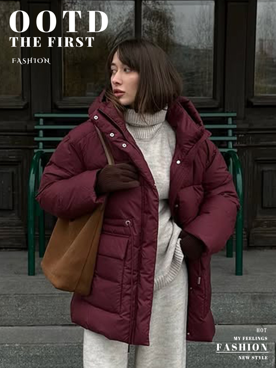 With its solid wine red color, this jacket pairs beautifully with a variety of outfits. Dress it up with a skirt or keep it casual with jeans; it's a versatile piece that complements any wardrobe. Plus, the absence of a fur collar ensures a clean and modern look that's easy to maintain.