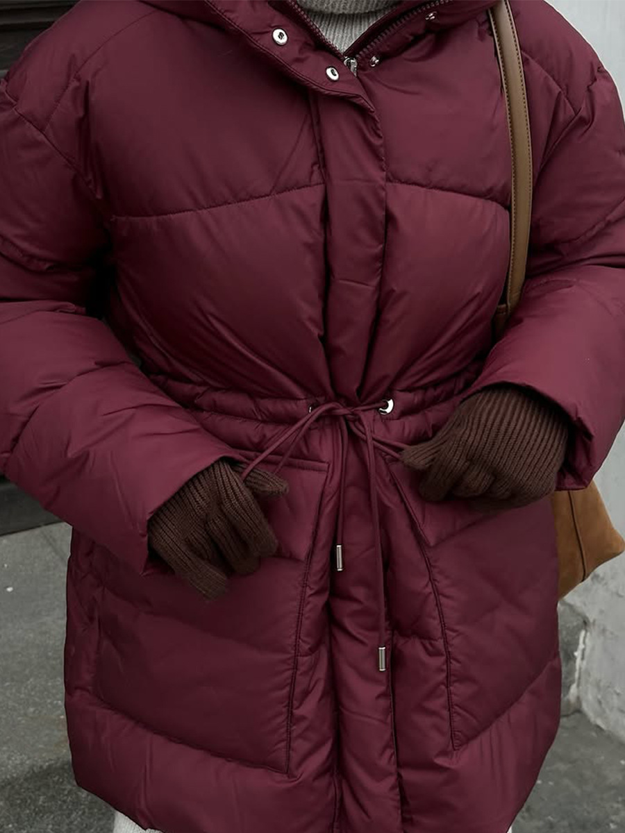This wine red hooded cotton jacket is the perfect blend of style and comfort, making it an essential addition to your outerwear collection. Designed for those who appreciate a casual yet chic look, this jacket features a versatile cinched style that flatters every body type. With its zipper closure and adjustable lace-up waist, you can achieve your desired fit while keeping warm during chilly days.
