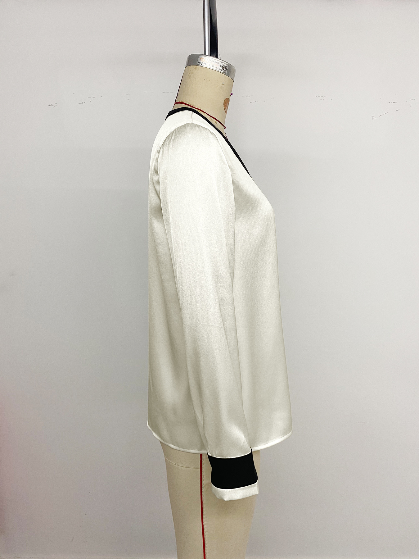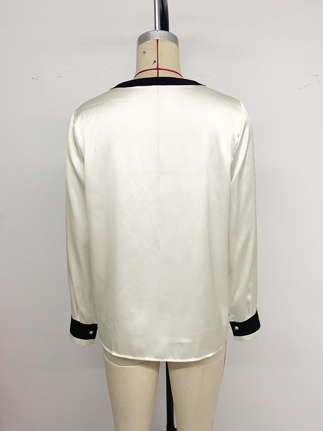 Discover the perfect blend of style and elegance with our Pearl Button T-shirt featuring a deep V-neck and color-block design. Made from high-quality polyester satin, this chic blouse is perfect for both casual and formal occasions. The long sleeves and regular sleeve type provide a comfortable fit, while the unique pearl button details add a touch of sophistication.