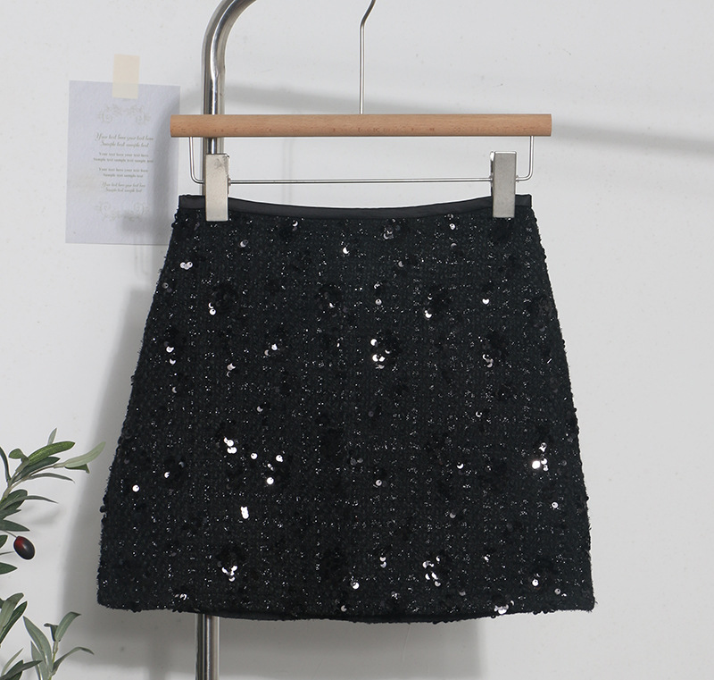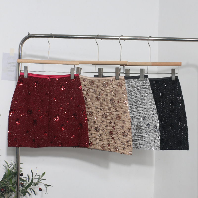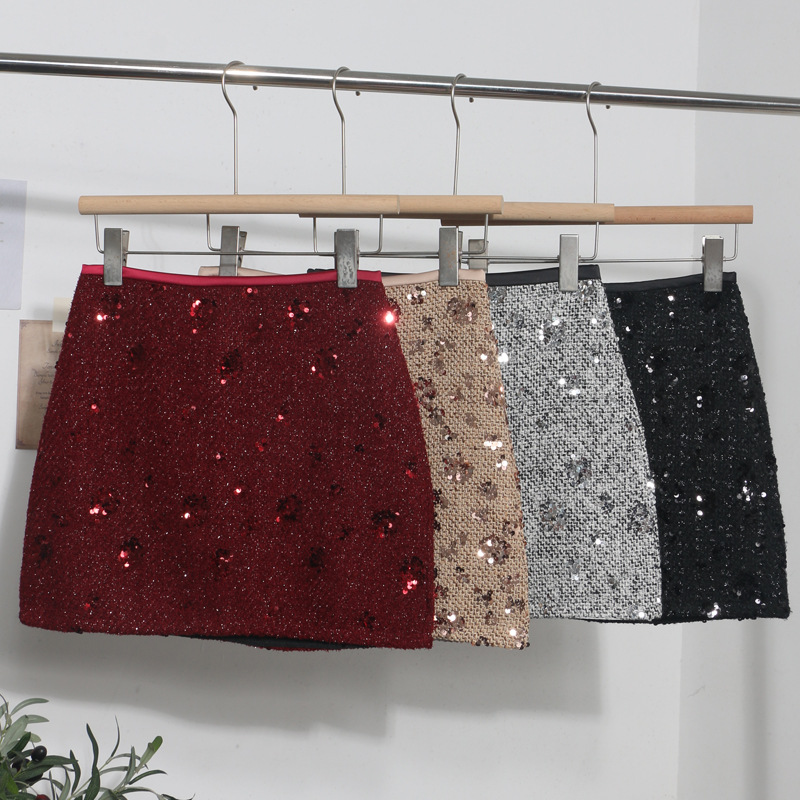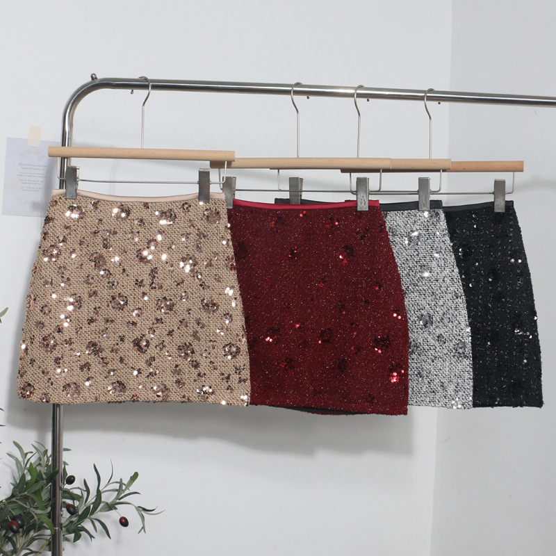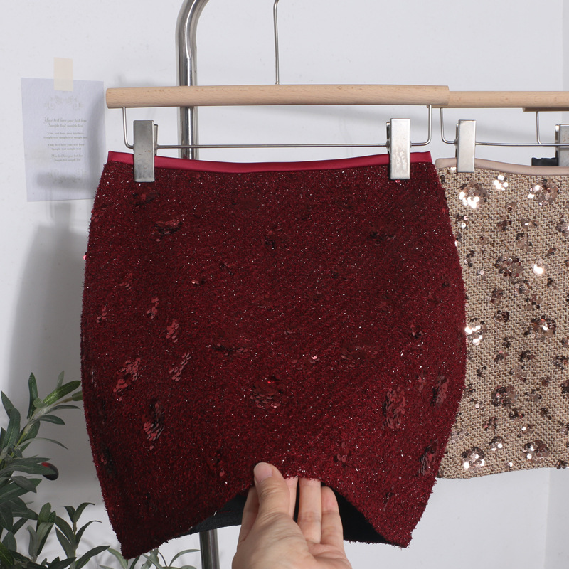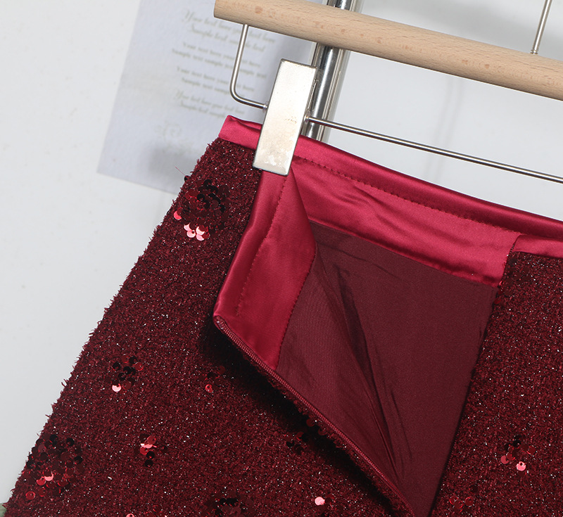 Sequined Red A-Line Skirt with High Waist Slimming Design